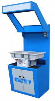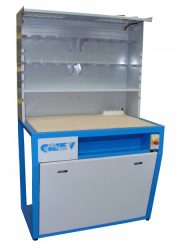 Banco de trabajo dotado de una unidad de aspiración con carbón activo, cajones de plástico para el material y recipientes para la cola. Voltaje: 230/50, monofásico